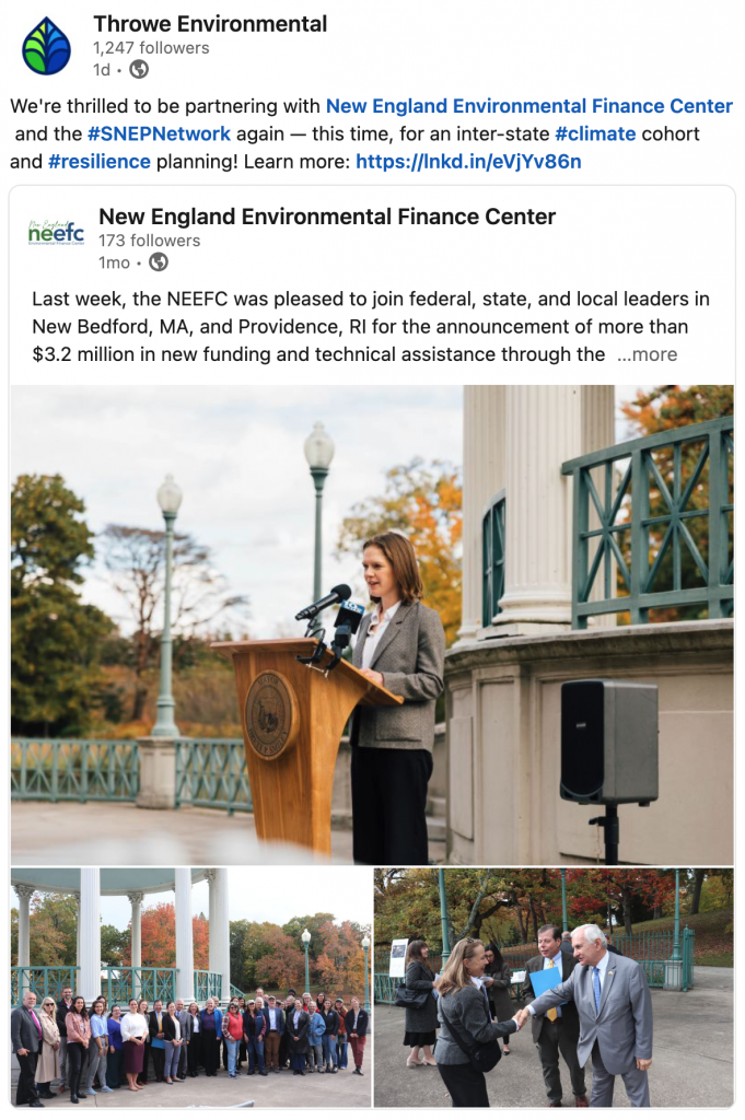 As a SNEP Network consultant, Throwe will conduct training, oversee direct community-specific technical assistance, and work collaboratively with municipal staff, SNEP Network partners, and state/regional Resilience Coordinators to advance resilience planning and project implementation in four communities: