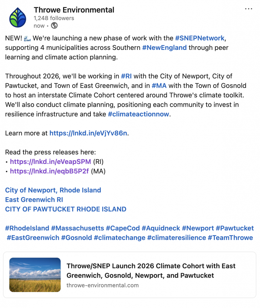From 2025-2026, Throwe will partner with the Southeast New England Program (SNEP) Network to provide training, capacity-building, and technical assistance through the Climate Resilience Training Cohort.